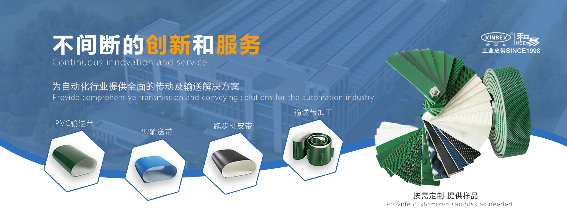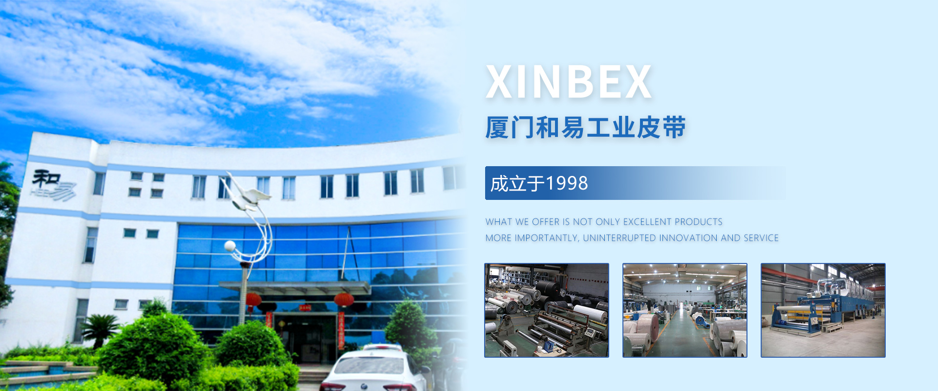 廈門和易工業(yè)皮帶有限公司XINBEX成立于1998年,是一家集研發(fā)、生產(chǎn)、服務(wù)于一體的專業(yè)工業(yè)帶公司。擁有自己的品牌,引進(jìn)了先進(jìn)的技術(shù)和生產(chǎn)設(shè)備。質(zhì)量管理體系已通過iso9001:2008認(rèn)證,產(chǎn)品質(zhì)量已通過SGS認(rèn)證。2021年,公司被評(píng)為國(guó)家高新技術(shù)企業(yè)(GR202135100917)。